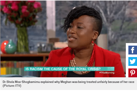 One thing I do know, is that we need to create equity in how and the circumstances under which these discussions occur, and this belief is derived from the other example I wanted to share that leads me to ask this question again now. Several months ago when the Great British Public’s favourite hobby was gossiping about Harry and Meghan, Dr Shola Mos-Shogbamimu (@SholaMos1) was invited to appear on Good Morning Britain to talk to three white people about whether or not the negative treatment of Meghan Markle in the press was in any way rooted in racism. Unsurprisingly, none of the three present thought that racism had anything to do with that antagonism. Equally unsurprisingly, Dr. Mos-Shogbamimu spoke incredibly eloquently on the subject, including the insight below: